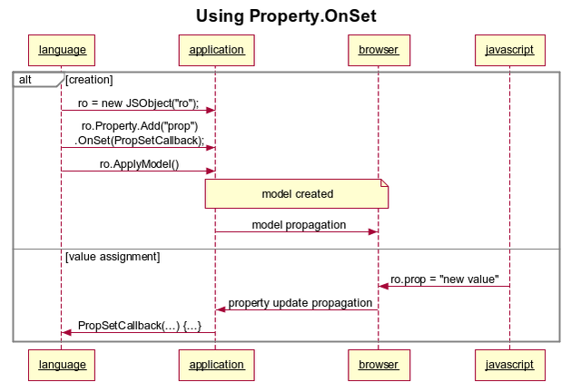 Whenever the value of a property is modified in the browser this change is propagated to the same property on the application side. If in the application the modified property has the OnSet event defined with its corresponding callback, the callback will be executed.